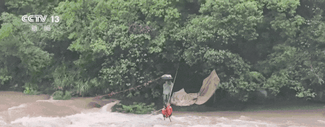 一名经验丰富的水域救援人员沿着绳索从激流上方越过,横渡抵达对岸,协助两人穿戴好救生装备,保护他们渡河。近三小时后,两人被安全救回岸边。