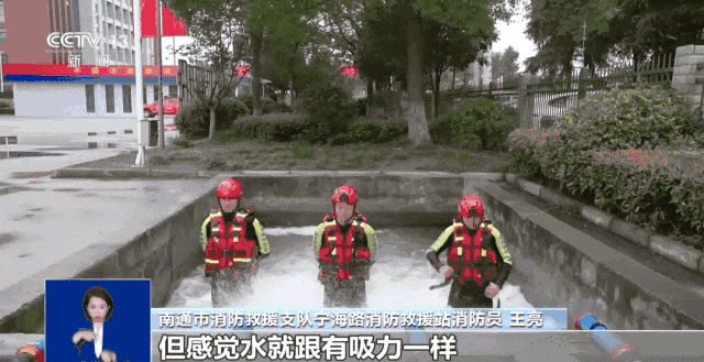 此后,多组人员进行重复试验,在水流冲击下,都在1分钟左右被冲倒。在急流中,消防员尝试逃离,仅艰难走出几步,就已经无法从湍急的水流中站起身。